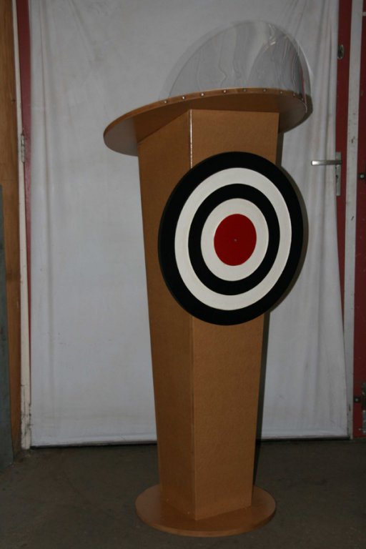 Voor “Gooi een tomaat naar een schrijver of een roos naar een zangeres” van Ernest van der Kwast, was de vraag of er een spreekgestoelte kon komen waarbij het kruis van de schrijver wat meer bescherming kon krijgen. Het publiek had de neiging op bepaalde plekken te mikken met de tomaten. Ik heb derhalve een lessenaar gemaakt met een “roos” ter hoogte van het kruis en een spatschermpje.