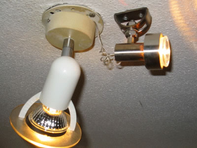 In opdracht van een particulier ontworpen en vervaardigd plafondspotje. De opdracht was een zo klein mogelijk spotje te maken, liefst uit RVS. Het kleine formaat blijkt goed uit de ernaast gemonteerde standaard plafondspot.  In de plafonddoos zit de transformator gemonteerd.