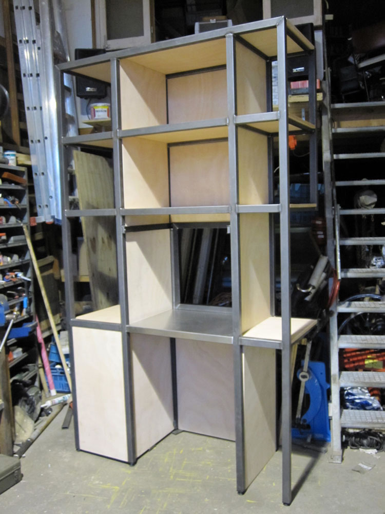 De kast is vormgegeven uit staalprofiel, met ingelegd houten planken en een RVS blad.